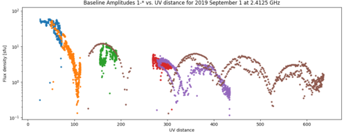 One can use the data themselves to estimate the size of the disk needed to fit the data. As it turns out, EOVSA visibilities provide excellent measures of the disk shape and flux density if we can make use of it. After a lot of effort, I believe we have an understanding of how to interpret the EOVSA visibilities in terms of the disk shape and flux density, and therefore how to fit the data to derive estimates for the three key parameters: equatorial radius, polar radius, and flux density. In practice, the flux density seems to fit quite well with the flux density imposed by the total power/auto-correlation calibration, so it is likely that we will do better just using the nominal flux density imposed from RSTN. Figure 1 shows an example of some data for 2019 Sep 01.